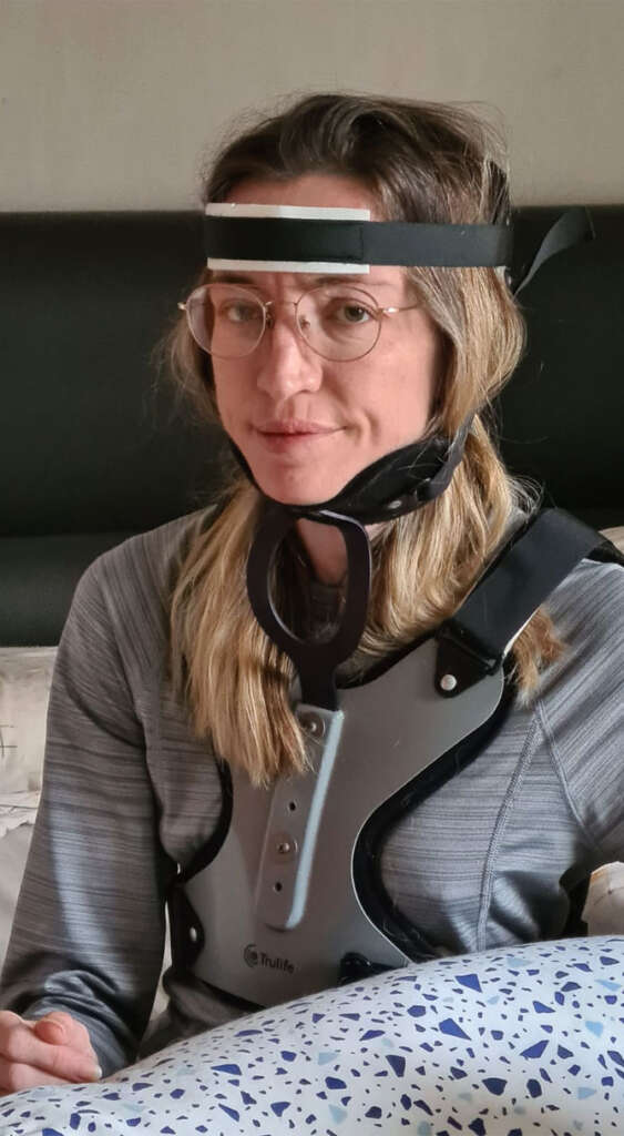 After neck injuries from an accident, she developed a severe complication: CCI-AAI (Cranio-Cervical Instability and Atlanto-Axial Instability). In other words: Melissa’s neck can no longer support her head. The damaged ligaments are no longer keeping the neck vertebrae in place.